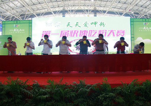 副会长单位怀化市天天粉业有限公司正在开展米粉知识普及和酣畅淋漓的快速吃粉大赛