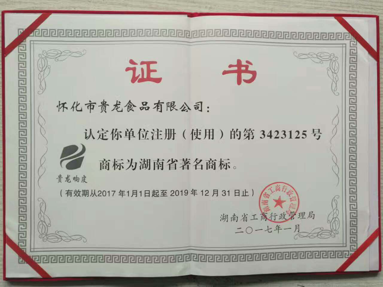 热烈祝贺协会理事单位——贵龙食品有限公司的“贵龙响皮”商标荣获湖南省著名商标