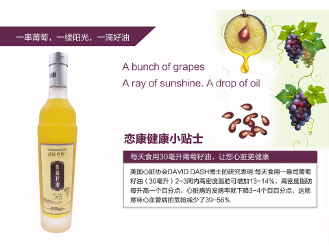 葡萄籽油含有丰富的不饱和脂肪酸,主要是油酸和亚油酸,其中亚油酸的含量高达72%~76%。亚油酸是人体必需脂肪酸,易于被人体吸收,长期食用葡萄籽油可降低人体血清胆固醇,有效调节人的植物神经功能。葡萄籽油富含维生素E,具有较强的抗氧化性,能够有效地延长货架保质期,不易引起由于光照、热辐射和与空气接触而产生的氧化酸败现象。由于自身性能比较稳定,除了作为烹调油直接在餐桌上食用和用于制作各种食品之外,葡萄籽油还是制作高级化妆品和药品的重要原料之一。葡萄籽油中还含有人体必需的钾、钠、钙等矿物质及各种脂溶性及水溶性维生素,适合用于制作老人及婴幼儿营养食品、医疗食品及高空作业人员专用食品