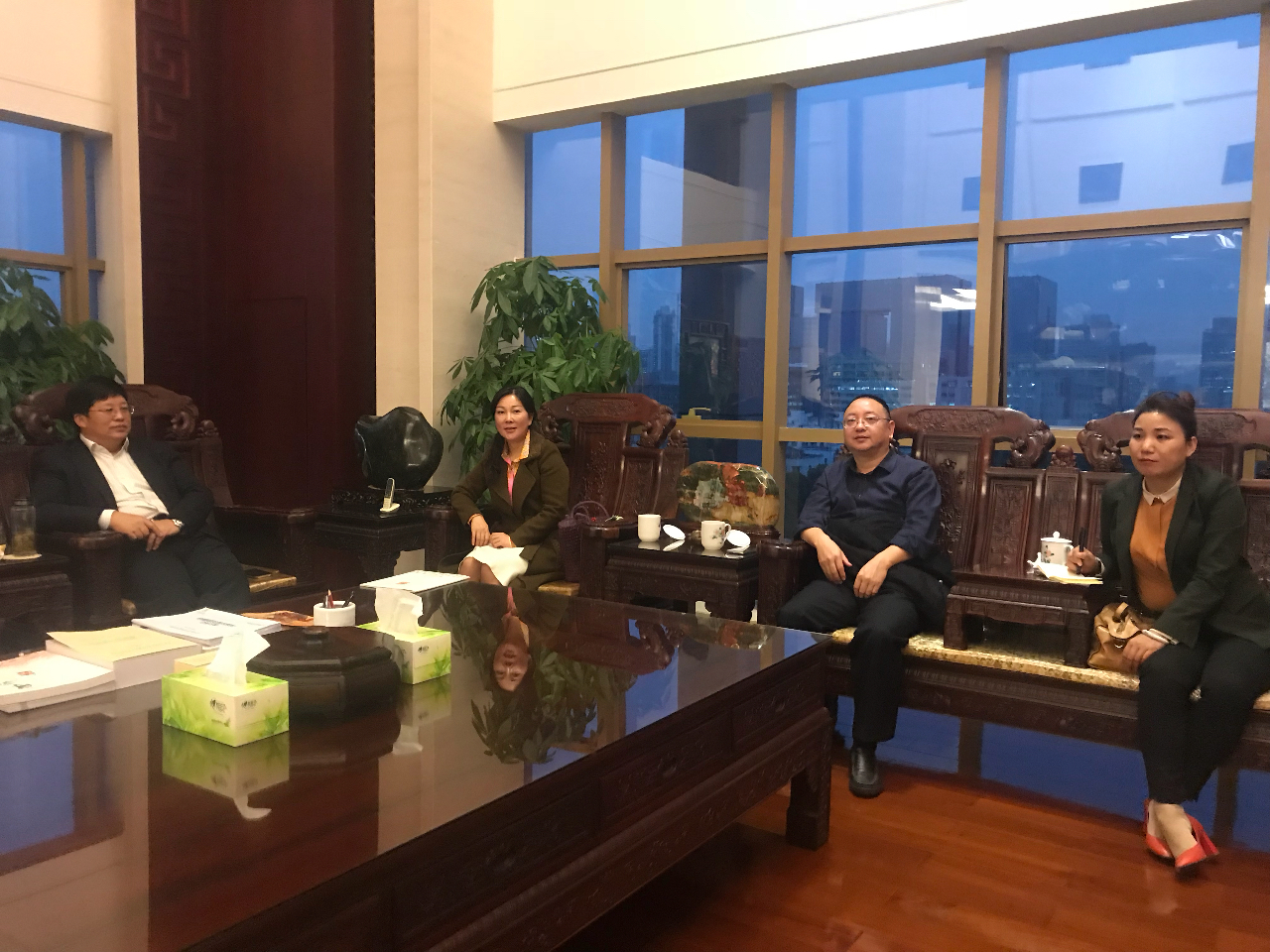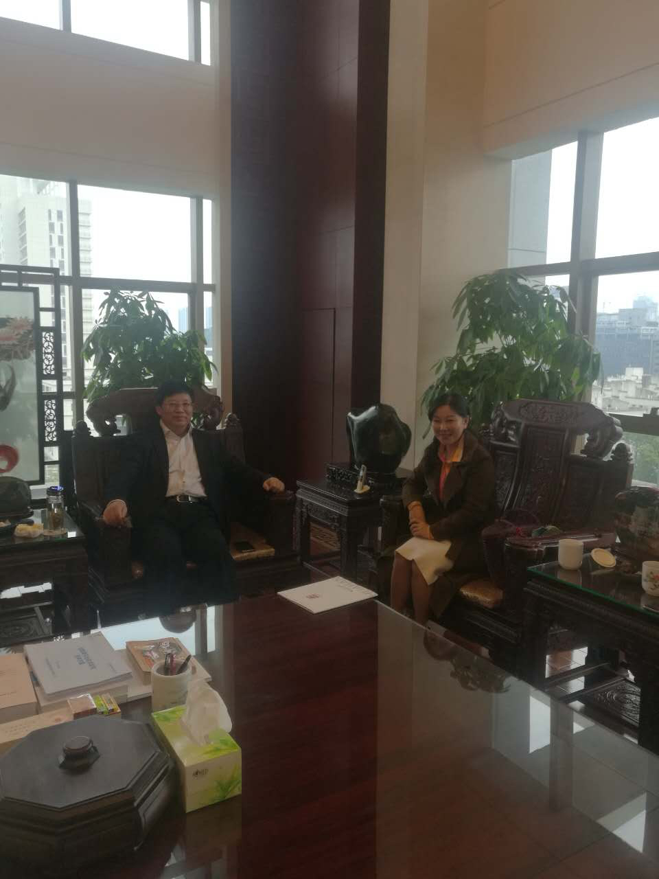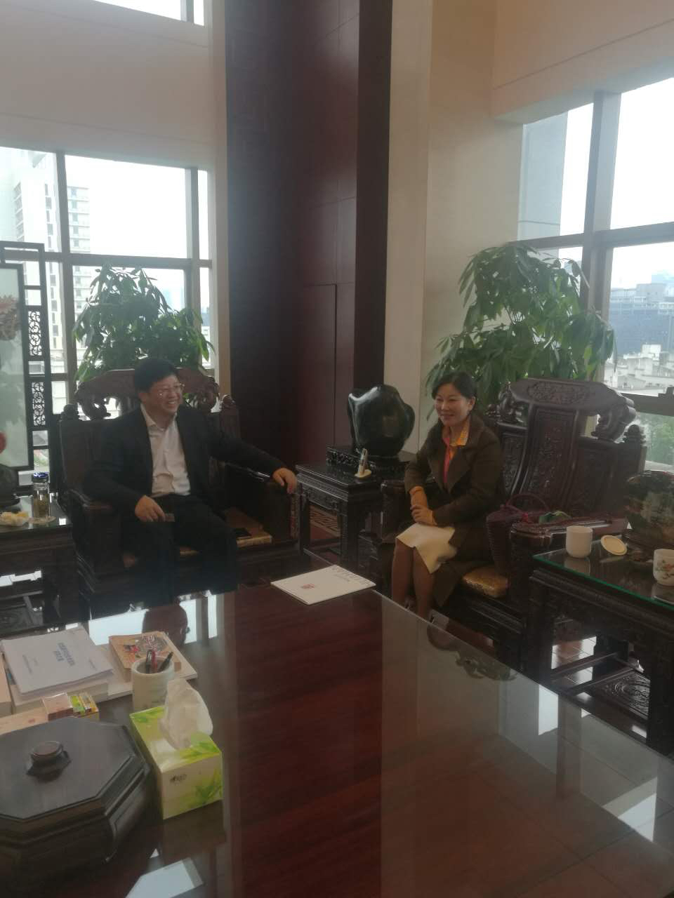 在广东省怀化商会王东旭秘书长的陪同下,张会长来到深圳华瀚集团公司,专程拜访广东怀化商会会长、董事长郑能欢先生,对怀化食品行业的发展现状和各种优势做了详细介绍。郑会长表示,构建农业产业集团合作,对家乡农业发展,意义深远,前景广阔!家乡的美食具有独特优势,在深圳有巨大的消费市场。他将不遗余力地支持家乡优质农产品进入深圳市场,条件成熟时将进一步参与投资合作。