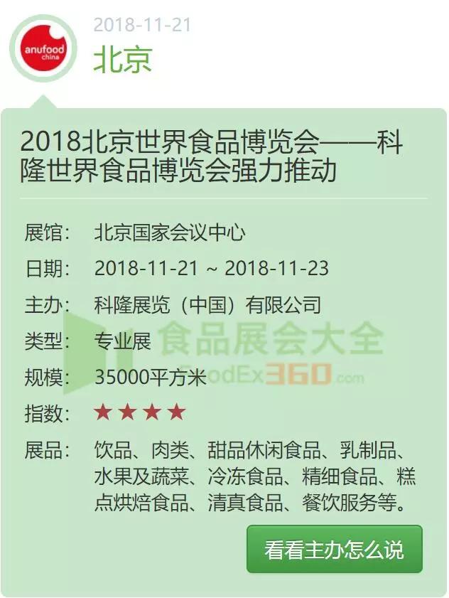 北京世界食品博览会(Anufood China),是德国科隆世界食品展Anufood在中国市场的子展。其母展Anufood是全球第一大食品展会,规模盛大,享誉全球。其泰国、新加坡等系列子展,知名度也很高,在食品行业影响深远。