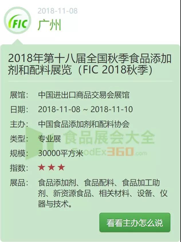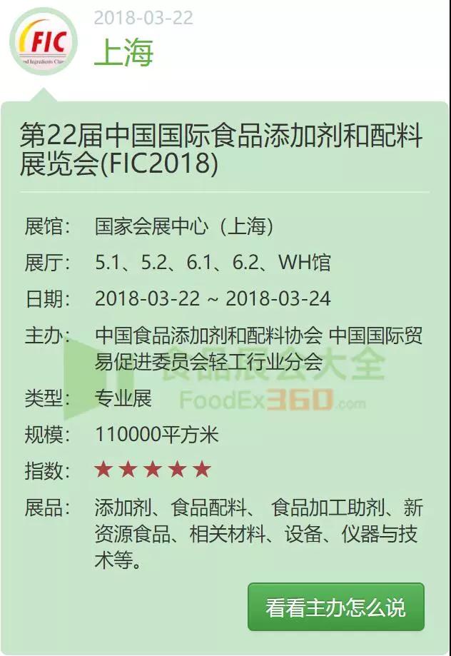 FIC展由中国食品添加剂和配料协会、中国国际贸易促进委员会轻工行业分会联合主办。FIC展会是亚洲地区最大的食品添加剂与配料行业专业展会,也是唯一一个展出面积在10万平米以上的添加剂配料领域专业市场展会,展会规模遥遥领先于其它竞争对手。