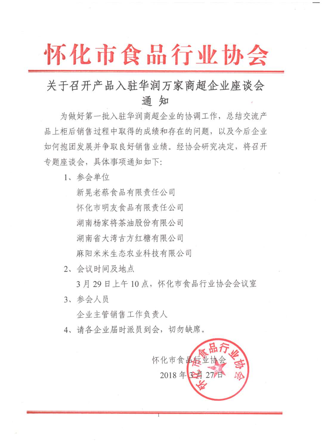为争取怀化农特产品进入长沙华润万家商超有更好的销售业绩,妥善解决第一批入驻华润万家商超会员企业产品销售过程中出现的问题,3月29日上午,在怀化市食品行业协会会议室召开了“产品入驻华润万家商超企业座谈会”。