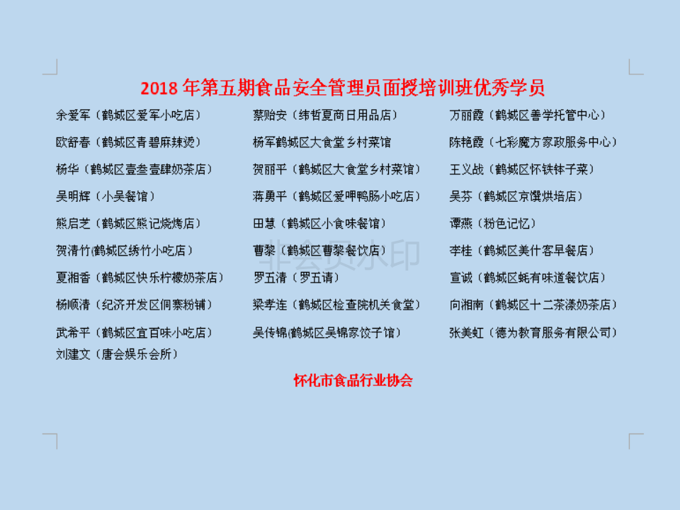 保证食品安全,保障公众身体健康和生命安全。在我国,国家高度重视食品安全。而从事餐饮生产、经营、服务行业的工作者们更重视食品安全。在第五期食品安全管理员面授培训中他们表现积极,面对不懂的知识点及时询问,并在课后认真巩固学习知识。他们被授予优秀学员称号,现将名单公示: