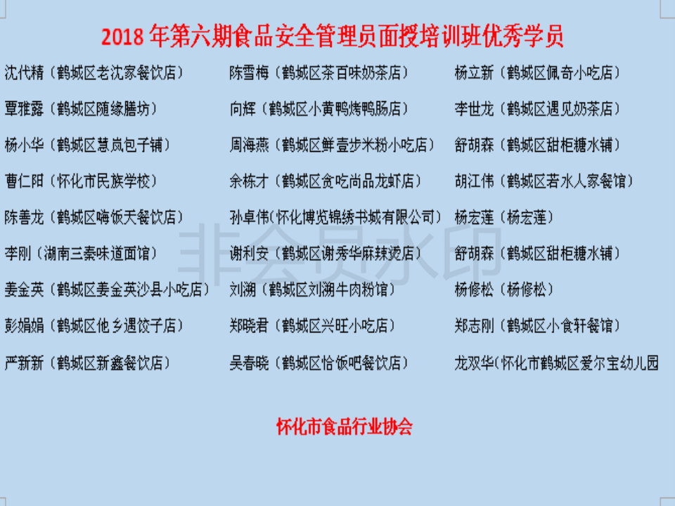 食品安全管理员制度是根据《食品安全法》规定制定的,做好对经营食品的检验工作,依法从事食品经营活动。在第六期食品安全管理员面授培训中,很多同学不仅学到了食品安全管理员制度,而且还对食品安全相关法律法规进行了学习。其中有一些同学表现积极,学习刻苦。他们被评为第六期食品安全管理员面授培训优秀学员,现将名单公示: