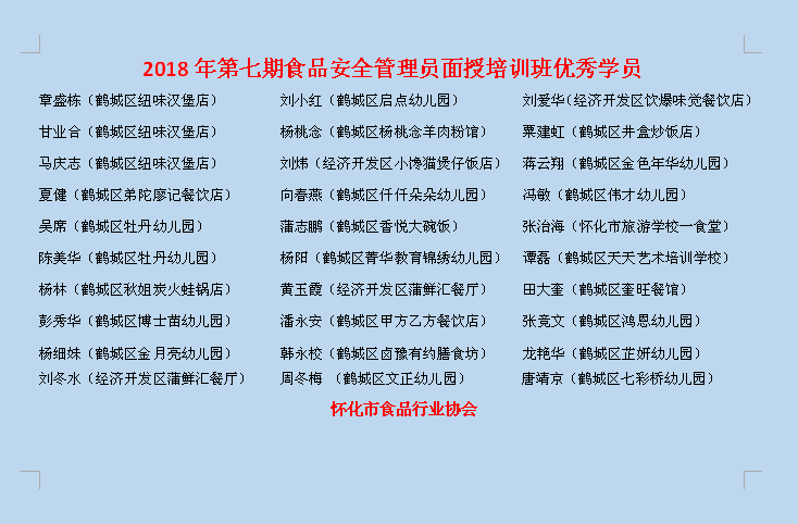 为规范餐饮服务经营行为,提升餐饮服务食品安全管理能力,履行食品安全主体责任,怀化市食品行业协会于12月14日开展了“食品安全”学习培训会。市区餐饮服务幼儿园、医院、养老机构、单位食堂等全体学员共100余人参加此次培训。其中有一些同学表现积极,学习刻苦。他们被评为第七期食品安全管理员面授培训优秀学员,现将名单公示: