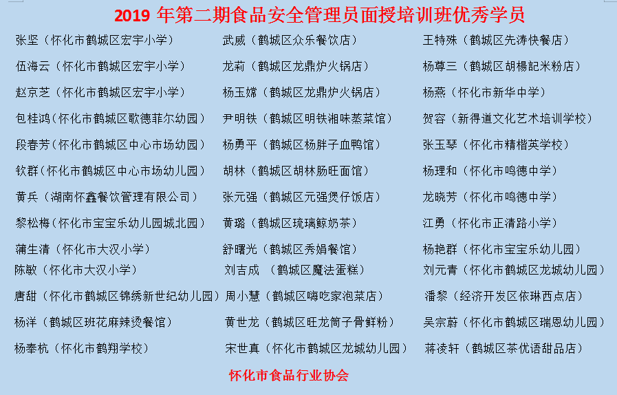 怀化市食品安全知识面授培训总45期2019年第二期优秀学员名单: