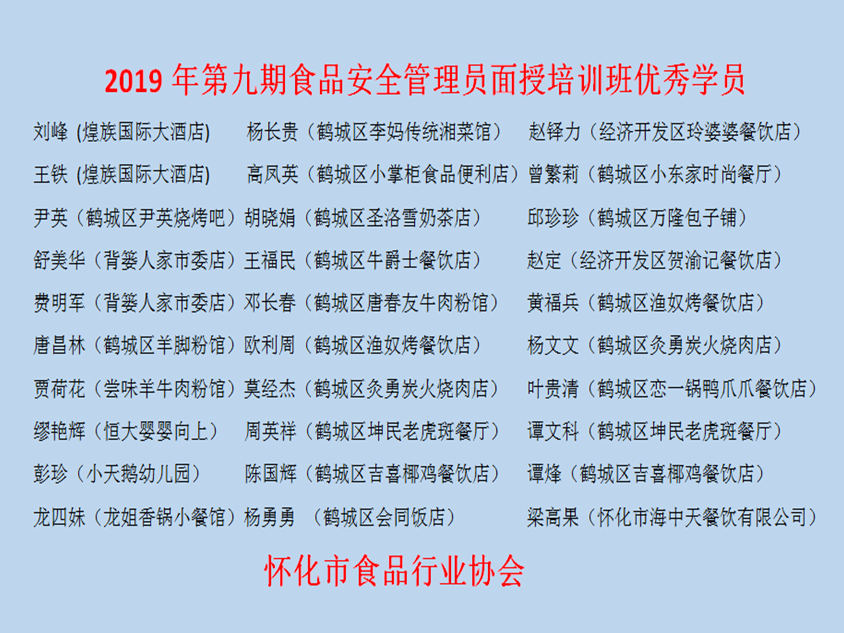 怀化市食品安全知识面授培训总52期2019年第九期优秀学员名单