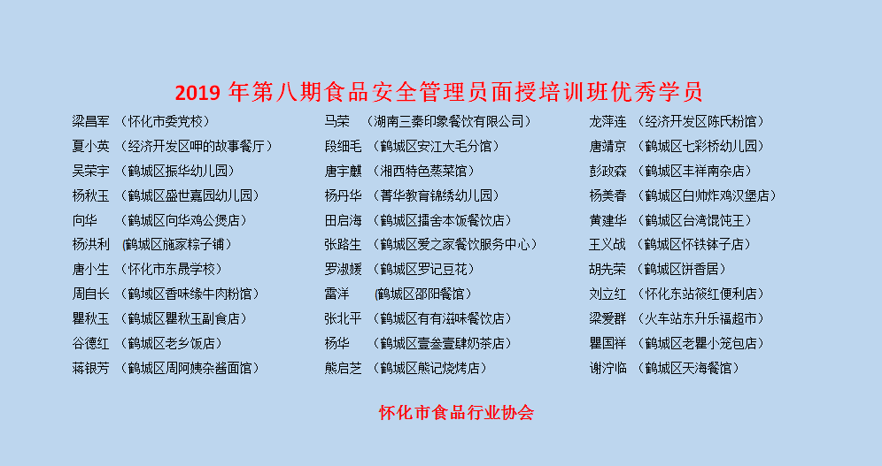 怀化市食品安全知识面授培总51期2019年第八期优秀学员名单