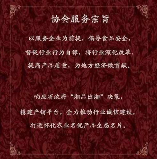同时,还制定了协会宗旨:以服务企业为前提,倡导食品安全。督促行业行为自律,将行业深化改革。提高产品质量,为地方经济做贡献。响应省政府“湘品出湘”决策,搭建产销平台,全力推动行业诚信建设,打造怀化农业名优产品生态名片。