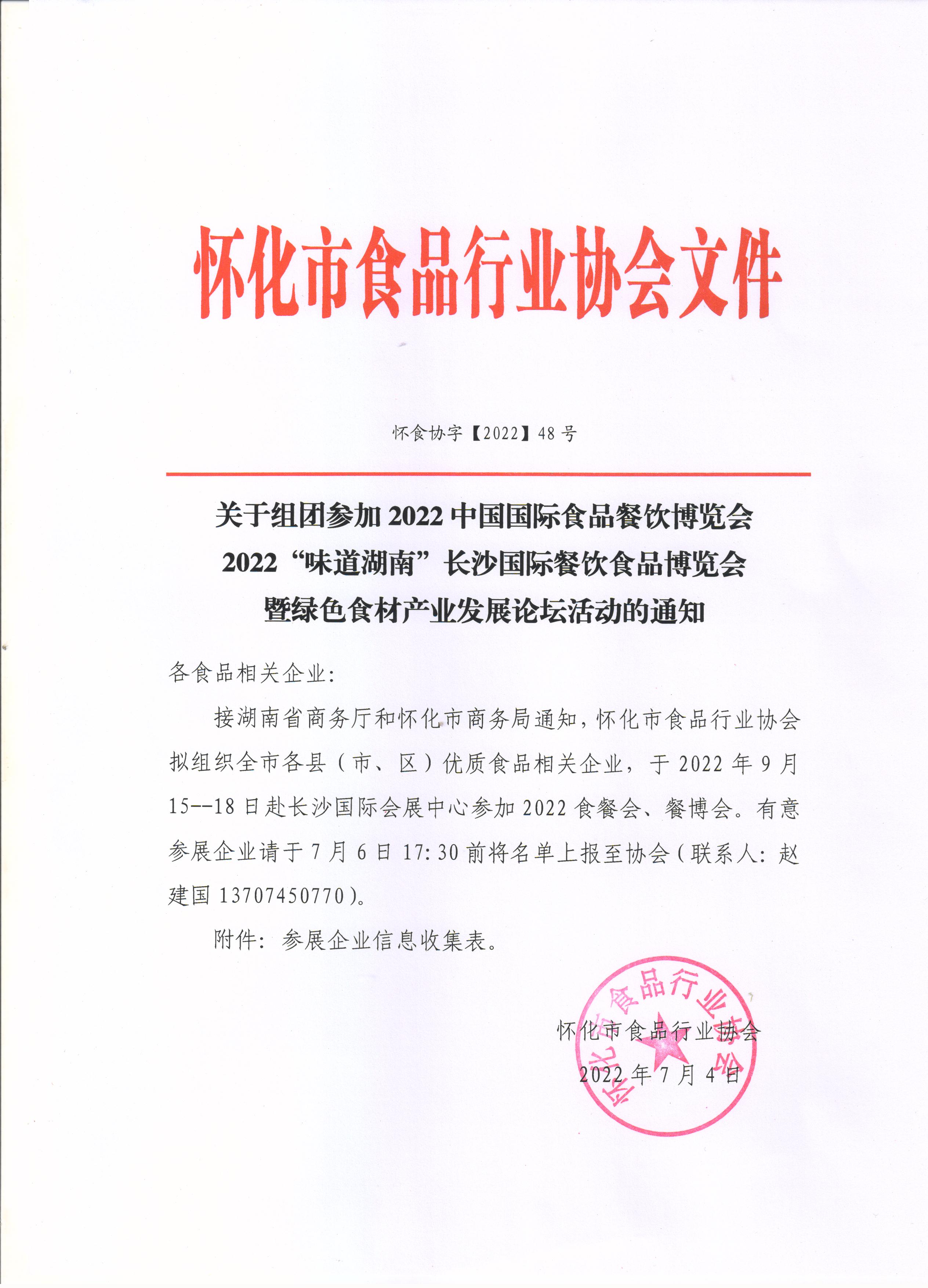 关于组团参加2022中国国际食品餐饮博览会 2022“味道湖南”长沙国际餐饮食品博览会 暨绿色食材产业发展论坛活动的通知